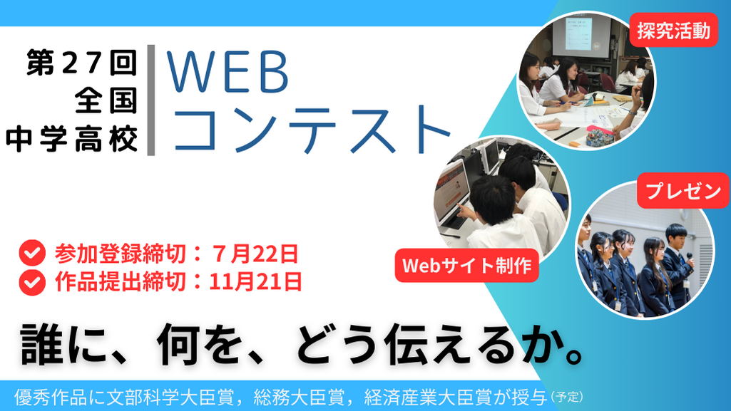 主催 特定非営利活動法人学校インターネット教育推進協会 参加資格 2024年4月2日現在、12才~18才以下であること。チーム構成は、生徒3~5名+コーチ1名。チームを構成する生徒は、違う学校の生徒でも良い。チームには、前年度にファイナリストに選ばれた生徒が2名以上入っていてはいけない。 コーチは、参加資格のある学校において、教育職または専門職として勤務している者、または私設の教育機関で(例えば、民間の塾や団体等)の講師や職員。またはチームメンバーの保護者。 〆切 -