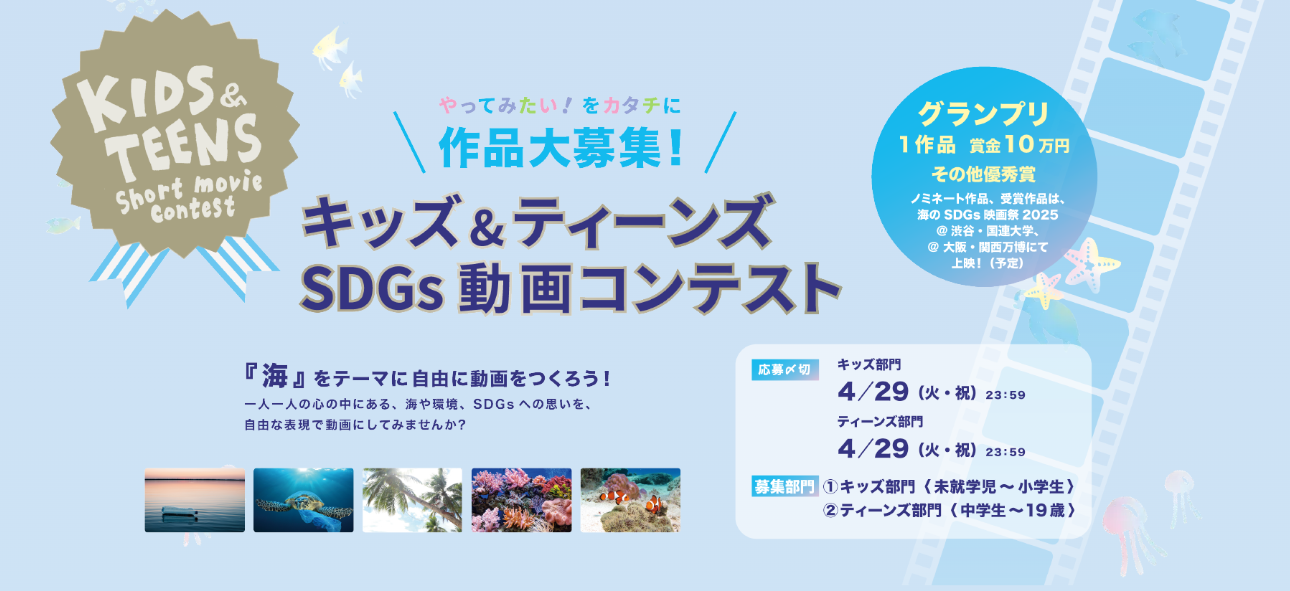 主催 海のSDGs映画祭実行委員会 参加資格 応募時点で中学生~19歳の方 ※個人でもチームでの参加も大歓迎! ※複数作品の応募可 〆切  -
